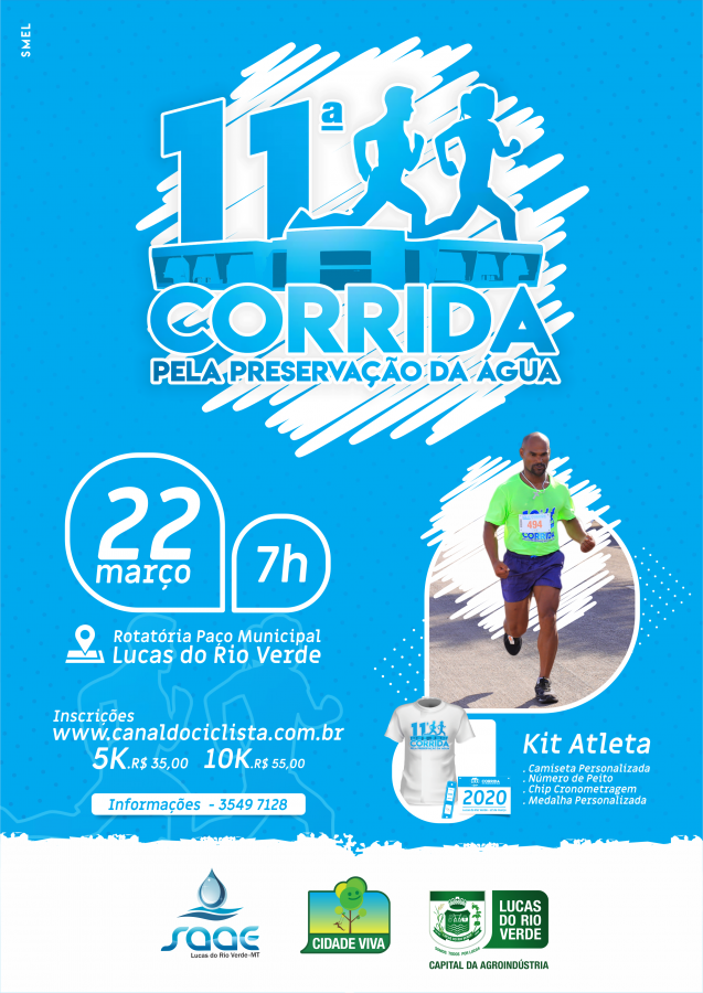 A Corrida pela Preservação da Água 2020 será realizada no dia 22 de março, na rotatória do Paço Municipal, com largada às 7h, e homologada pela FAMT – Federação de Atletismo de Mato Grosso.