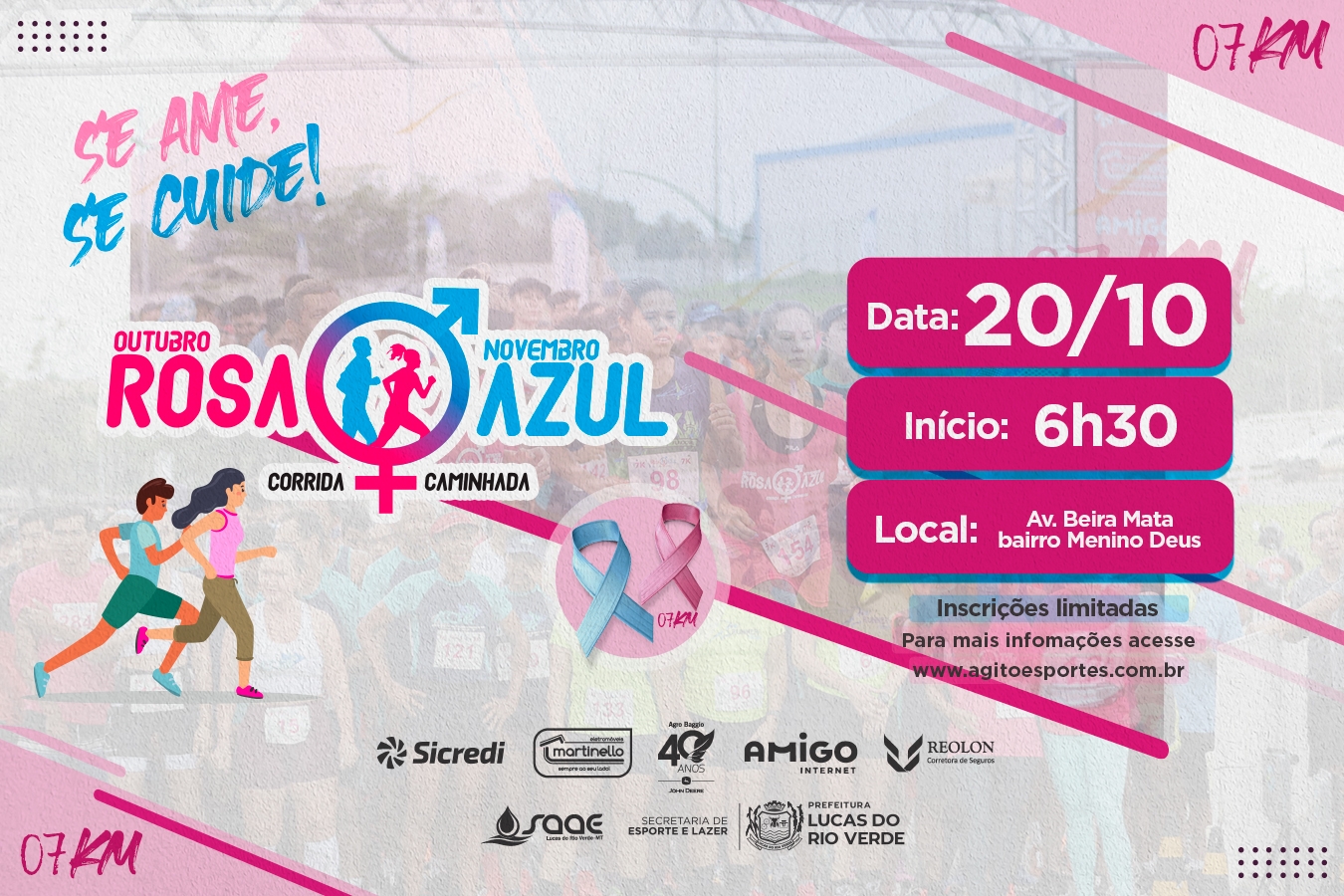 As inscrições estarão abertas a partir das 12h, limitadas a 500 participantes, até o dia 13 de outubro, no seguinte endereço eletrônico:https://www.agitoesportes.com.br/eventos/corrida-outubro-rosa-novembro-azul-lucas-do-rio-verde