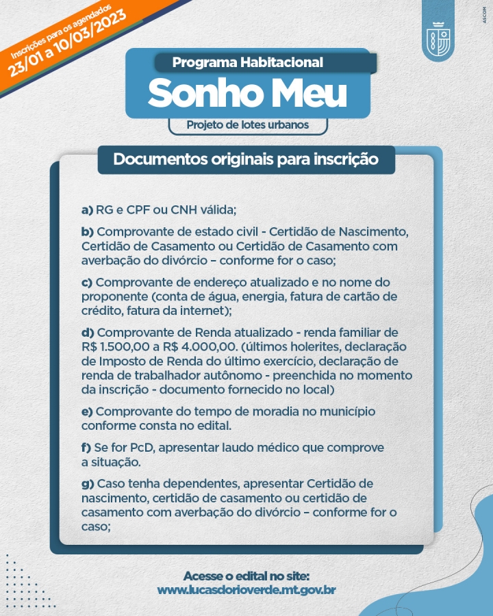 Inicia na próxima segunda-feira (23) e segue até 14 de abril o período de inscrição para o Projeto Habitacional Sonho Meu, com 107 lotes urbanos. A Secretaria de Assistência Social e Habitação de Lucas do Rio Verde alerta para a necessidade da apresentação de todos os documentos solicitados no edital.