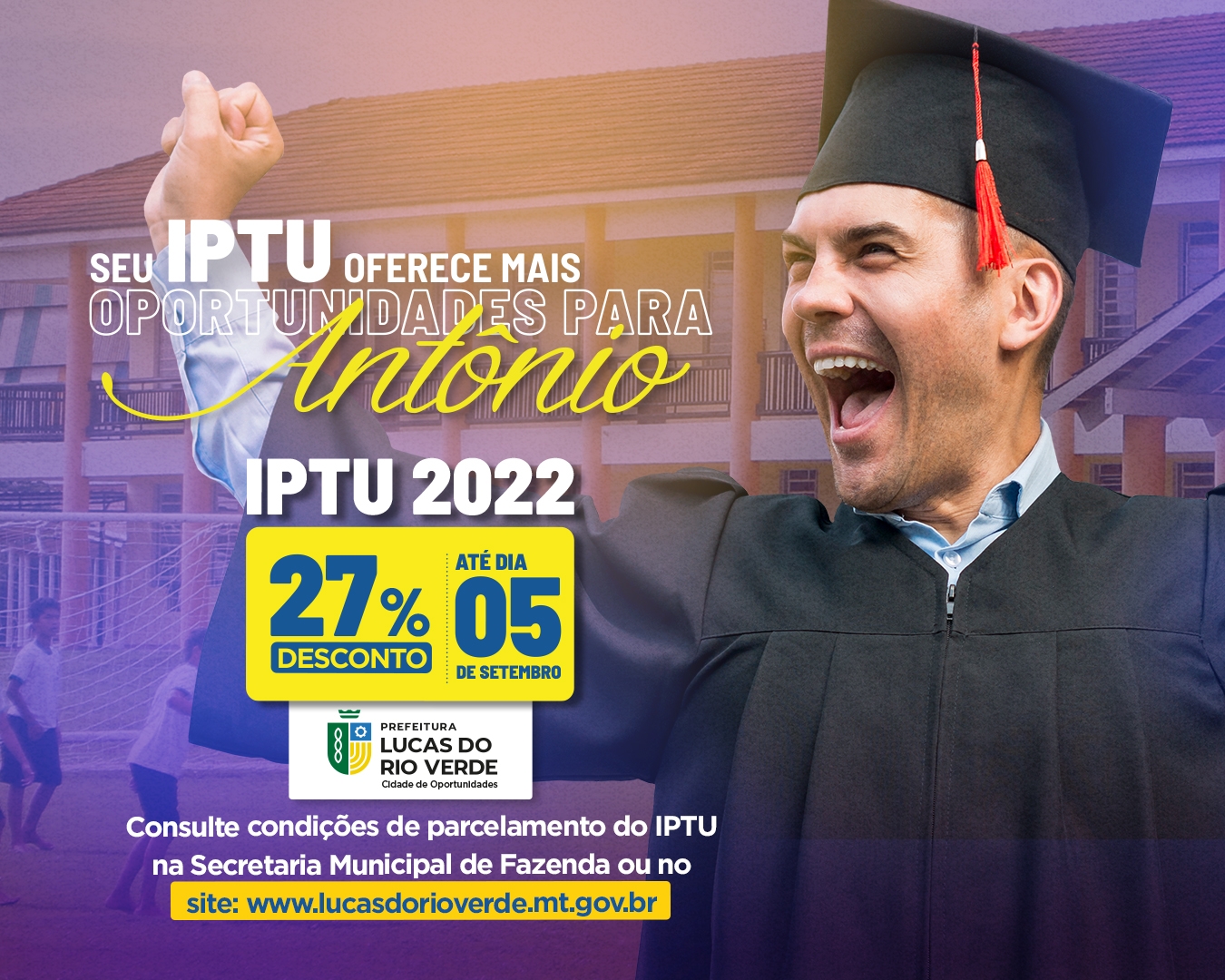 O prazo para pagamento do Imposto Predial Territorial Urbano - IPTU 2022, para quem optar pela quitação em cota única com desconto de 27%, termina nesta segunda-feira (05). A Prefeitura de Lucas do Rio Verde também oferece descontos para os imóveis com grama plantada, energia solar, entre outros.