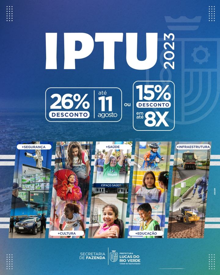 Contribuintes de Lucas do Rio Verde têm até sexta-feira (11) para garantir o desconto de 26% no Imposto Predial Territorial Urbano – IPTU 2023, pagamento em cota única. A campanha também oferece a opção de pagamento parcelado e dedução de 20% para imóveis com grama plantada, 5% para imóveis edificados e não edificados com passeio público e 5% em projetos de energia fotovoltaica.