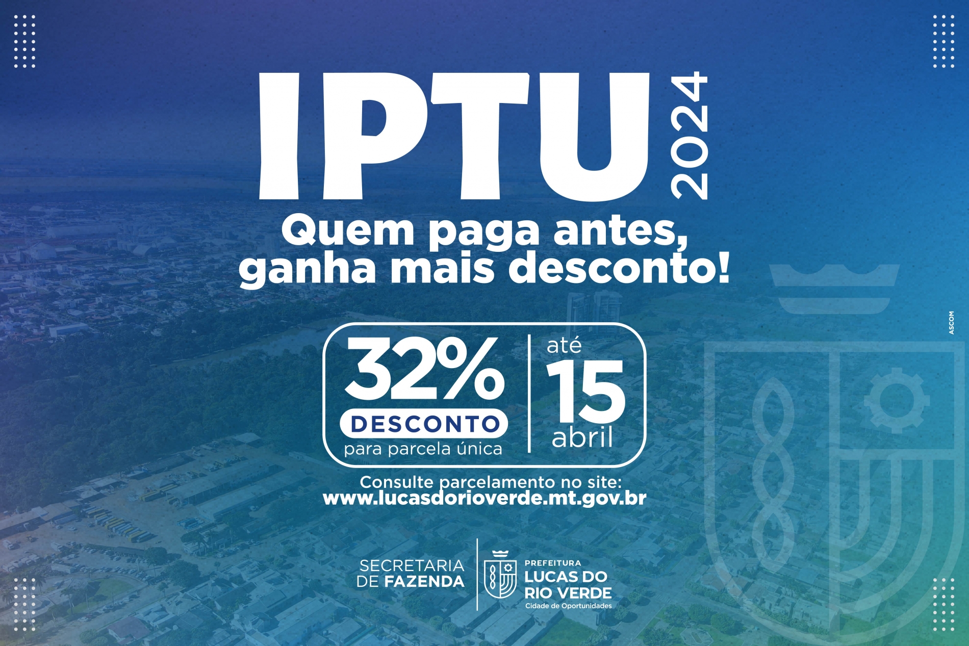 Conforme a Lei nº 3.652/2024, até 15 de abril o desconto será de 32% do valor do imposto. A campanha anual de incentivo ao pagamento do IPTU prevê dedução de 20% aos imóveis edificados e não edificados com plantio de grama intramuros; 15% às chácaras urbanas produtivas e utilizadas para moradia própria; 5% aos imóveis edificados e não edificados providos de passeio público e, ainda, 5% aos imóveis edificados que possuírem usina fotovoltaica (placa de energia solar).
