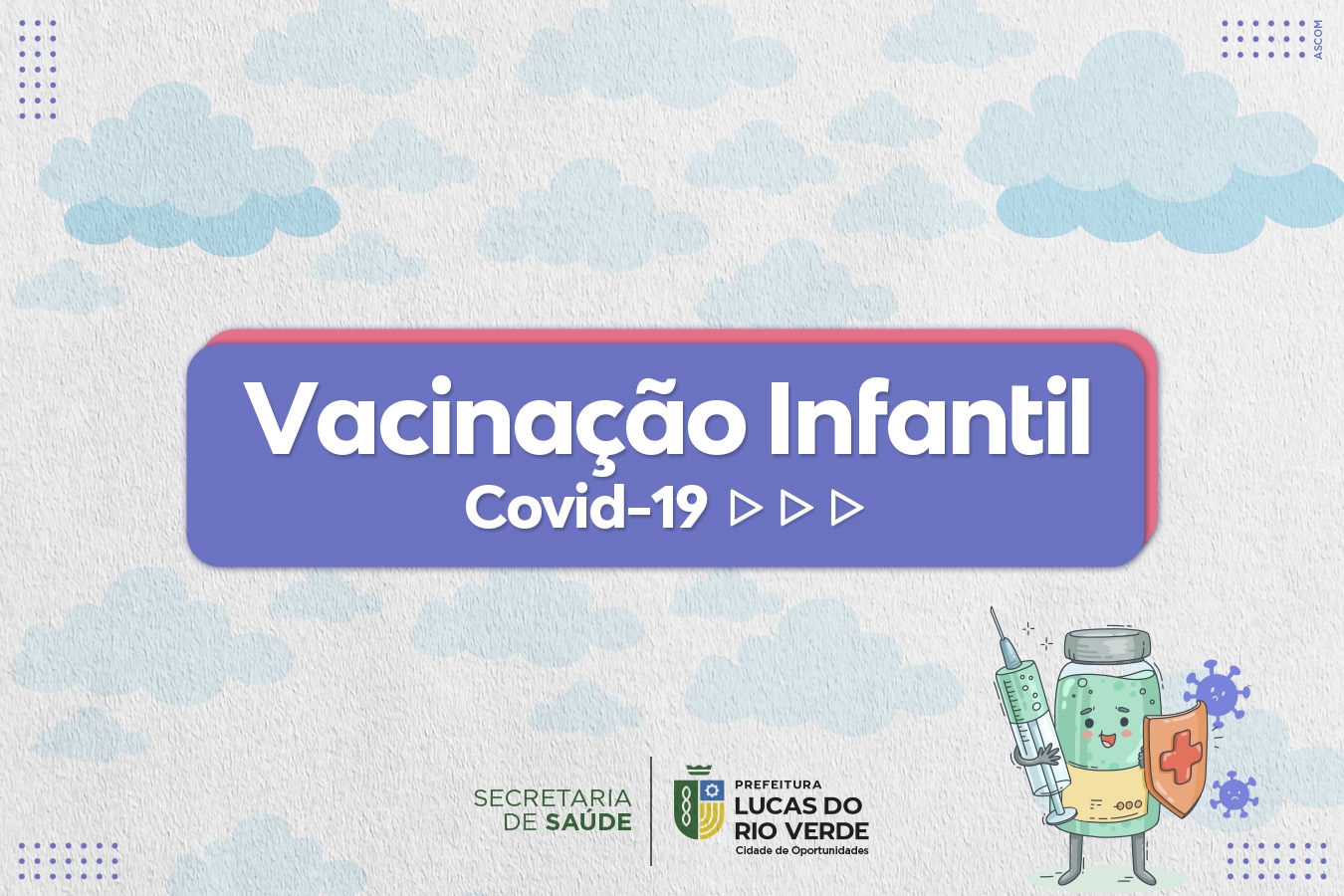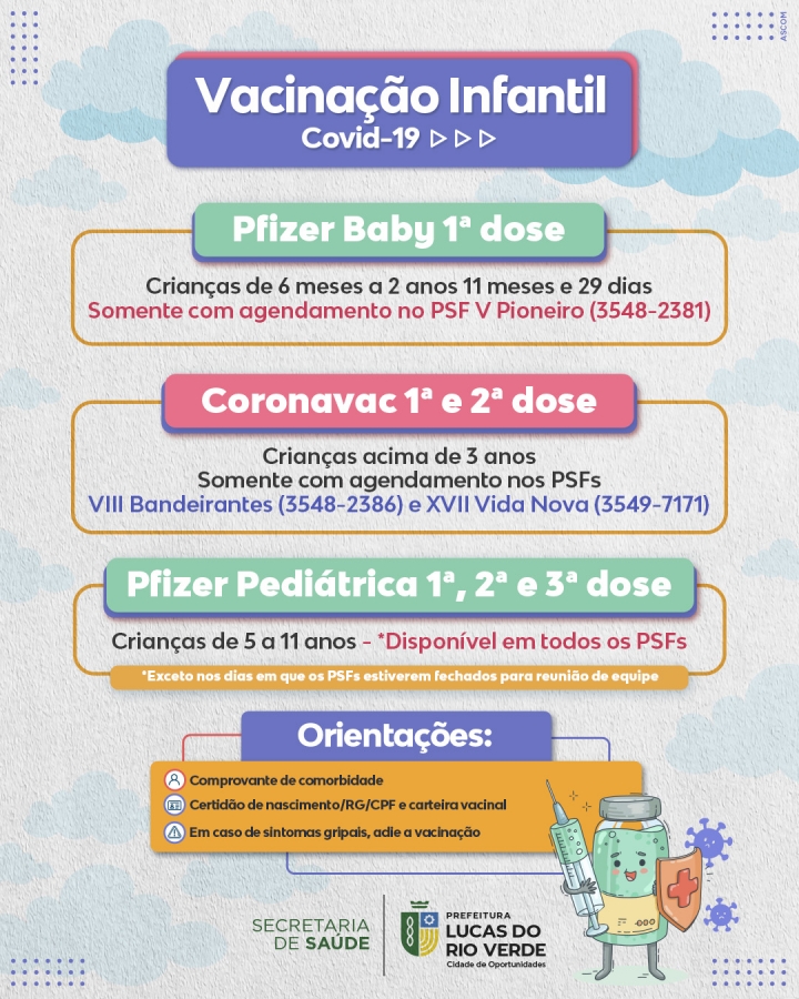 A Secretaria de Saúde de Lucas do Rio Verde informa que já está disponível a aplicação da 3ª dose da vacina contra a Covid-19 para crianças de 5 a 11 anos, que tomaram a segunda dose há, pelo menos, quatro meses. A aplicação da vacina infantil Pfizer Pediátrica está sendo feita em todos os PSFs e não é necessário fazer agendamento.