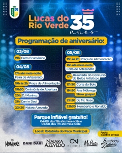 Está chegando a hora! No dia 05 de agosto, a cidade de oportunidades completa 35 anos de emancipação político-administrativa. Para comemorar esta data tão importante, a Prefeitura de Lucas do Rio Verde realizará uma festa popular gratuita que, este ano, acontecerá na rotatória do Paço Municipal.