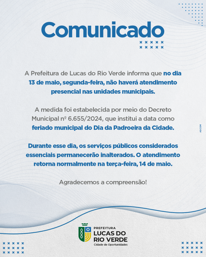 De acordo com o Decreto Municipal nº 6.655/2024, 13 de maio é feriado municipal.