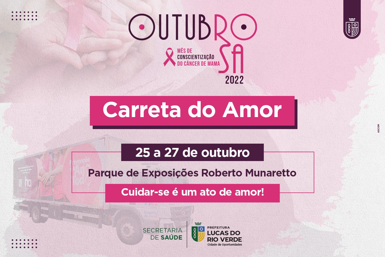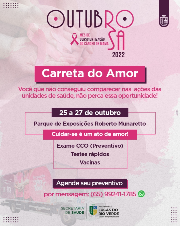 Lucas do Rio Verde recebe, na próxima semana, a Carreta do Amor para realização de exames preventivos ao câncer de mama e de colo de útero. A ação faz parte do cronograma de atividades do Outubro Rosa e é realizada por meio de parceria entre a Prefeitura de Lucas do Rio Verde, Hospital de Amor e Consórcio Público de Saúde Vale do Teles Pires.