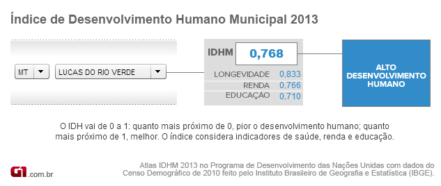 Lucas do Rio Verde obteve índice de 0,768 e ocupa a 249ª posição do ranking dos municípios mais desenvolvidos. Os dados do Índice de Desenvolvimento Humano Municipal (IDHM) de 5.565 municípios foram divulgados nesta segunda-feira (29) pelo Programa das Nações Unidas para o Desenvolvimento (Pnud).