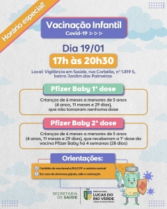 A Secretaria de Saúde de Lucas do Rio Verde realizará uma ação especial para vacinação infantil contra Covid. Crianças de 6 meses a menores de 5 anos (4 anos, 11 meses e 29 dias) poderão ser imunizadas em horário especial noturno.