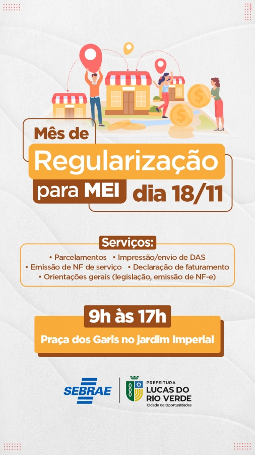 Neste sábado (18), a Praça dos Garis, no bairro Jardim Imperial, vai receber o Mutirão de Regularização para o Microempreendedor Individual (MEI). O evento é uma parceria entre a Prefeitura de Lucas do Rio Verde e o Serviço Brasileiro de Apoio às Micro e Pequenas Empresas (Sebrae).
