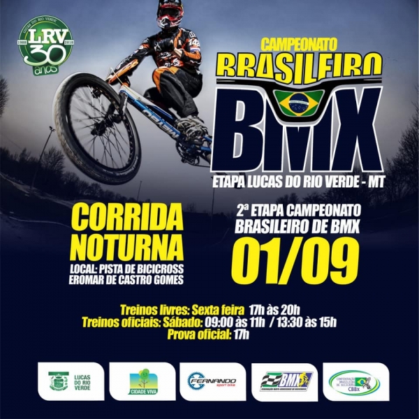 Lucas do Rio Verde será sede neste sábado (01/09) da segunda etapa do Campeonato Brasileiro de BMX 2018. A disputa aconteceu na pista de Bicicross Eromar Castro Gomes e a abertura oficial acontece às 17 horas.