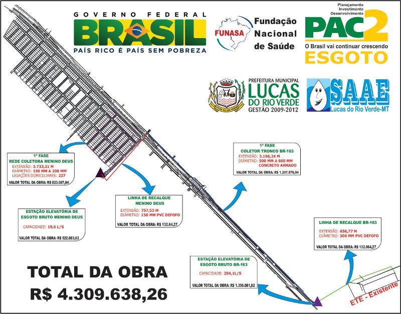De acordo com o diretor do Saae, a primeira fase do projeto contempla parte do Bairro Menino Deus com a rede de tratamento de esgoto e os bairros Bandeirantes e Parque das Emas com a construção de um coletor tronco para a captação dos resíduos.