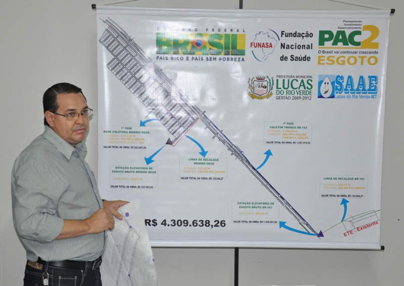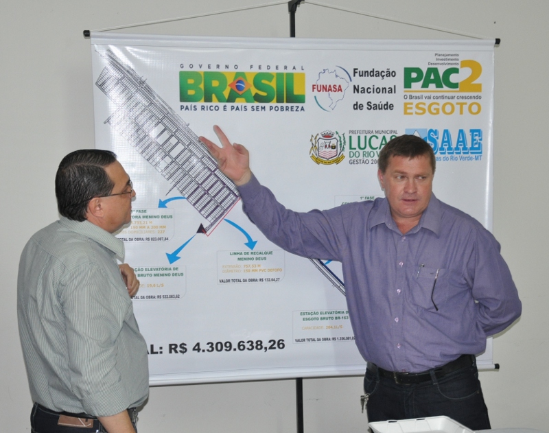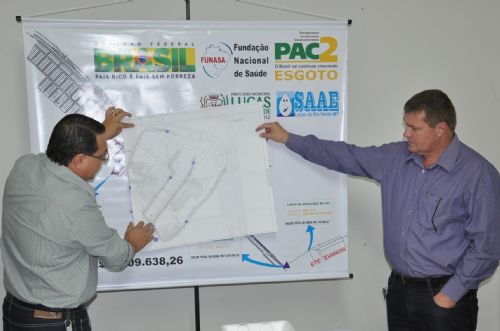 O prefeito de Lucas do Rio Verde, Marino Franz e o diretor do Serviço Autônomo de Água e Esgoto (Saae), Raimundo Dantas apresentaram na manhã de hoje (23) aos secretários municipais, vereadores e a imprensa local os detalhes do projeto de saneamento básico que terá início a partir de 2012.