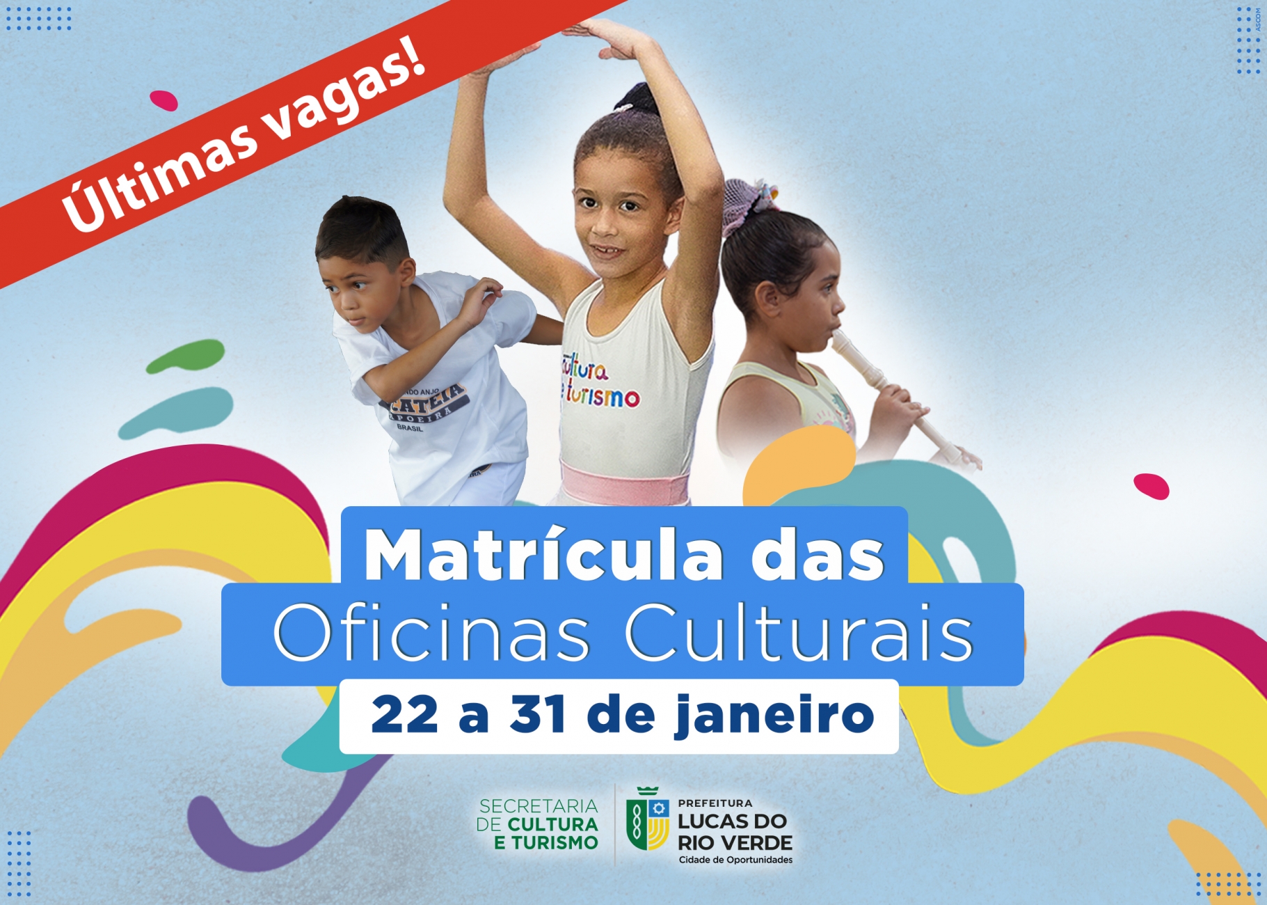 A Secretaria de Cultura e Turismo de Lucas do Rio Verde informa que o período de matrículas das oficinas culturais para novos alunos termina na próxima quarta-feira, dia 31 de janeiro. As aulas, promovidas gratuitamente para crianças e adolescentes do município, terão início no dia 05 de fevereiro.