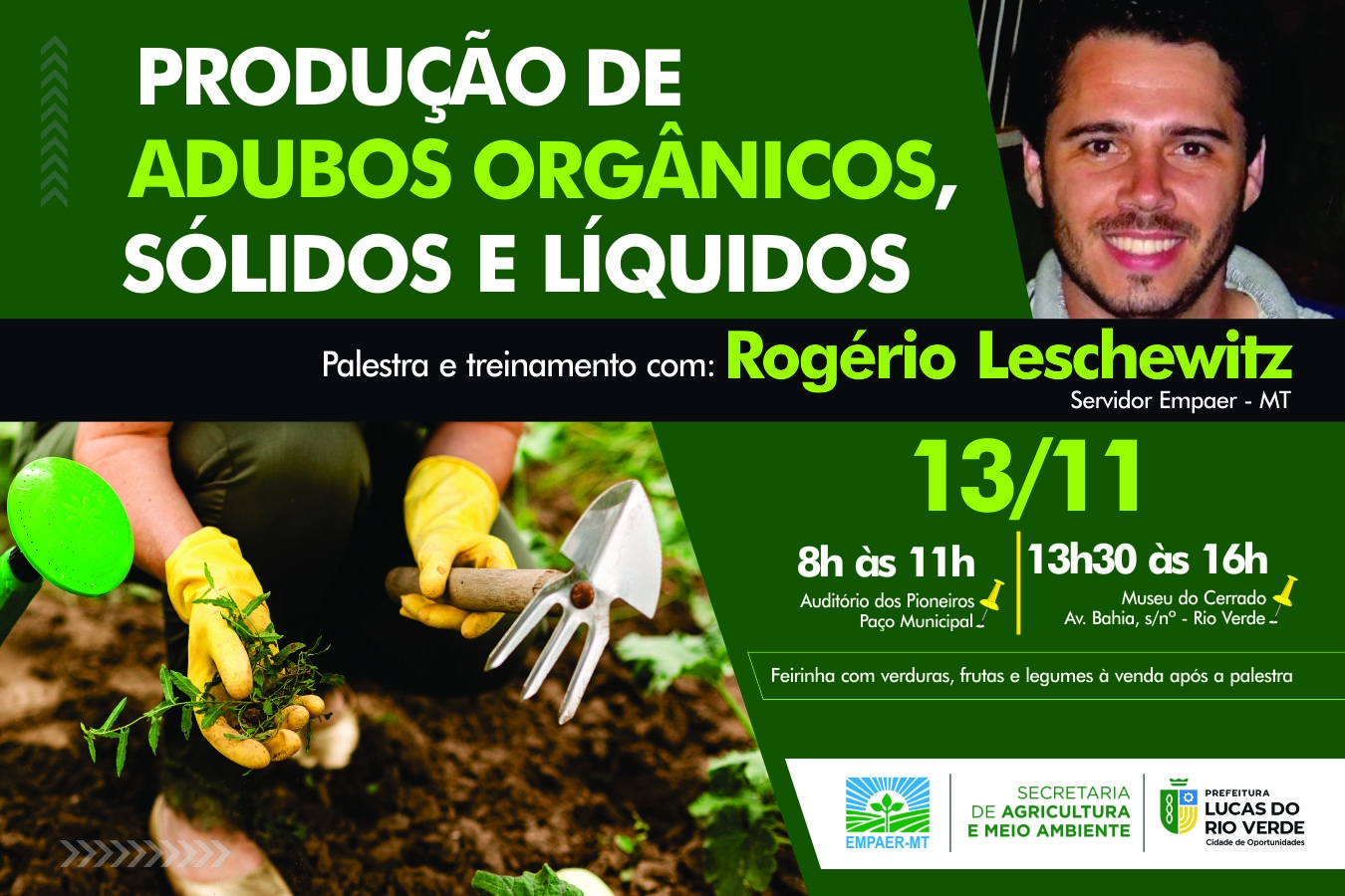 “Adubos Orgânicos, Sólidos e líquidos”, será tema de uma palestra e treinamento que acontecerá no dia 13 de novembro no município. A iniciativa é da Prefeitura Lucas do Rio Verde, por meio da Secretaria de Agricultura e Meio Ambiente e conta com parceria da Empresa Mato-grossense de Pesquisa, Assistência e Extensão Rural (Empaer).