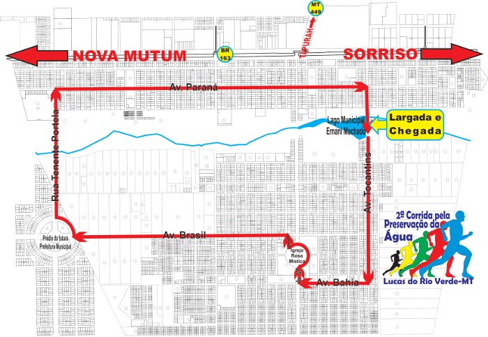 Largada no calçadão do Lago Ernani José Machado - Avenida Tocantins - Avenida Bahia – Avenida Mato Grosso – Parte da Rotatória da Rosa Mística – Rua Paranapanema – Avenida Brasil – Parte da Rotatória do futuro prédio da prefeitura - Avenida Tenente Portela – Avenida Paraná – Avenida Tocantins - Chegada no calçadão do Lago Ernani José Machado