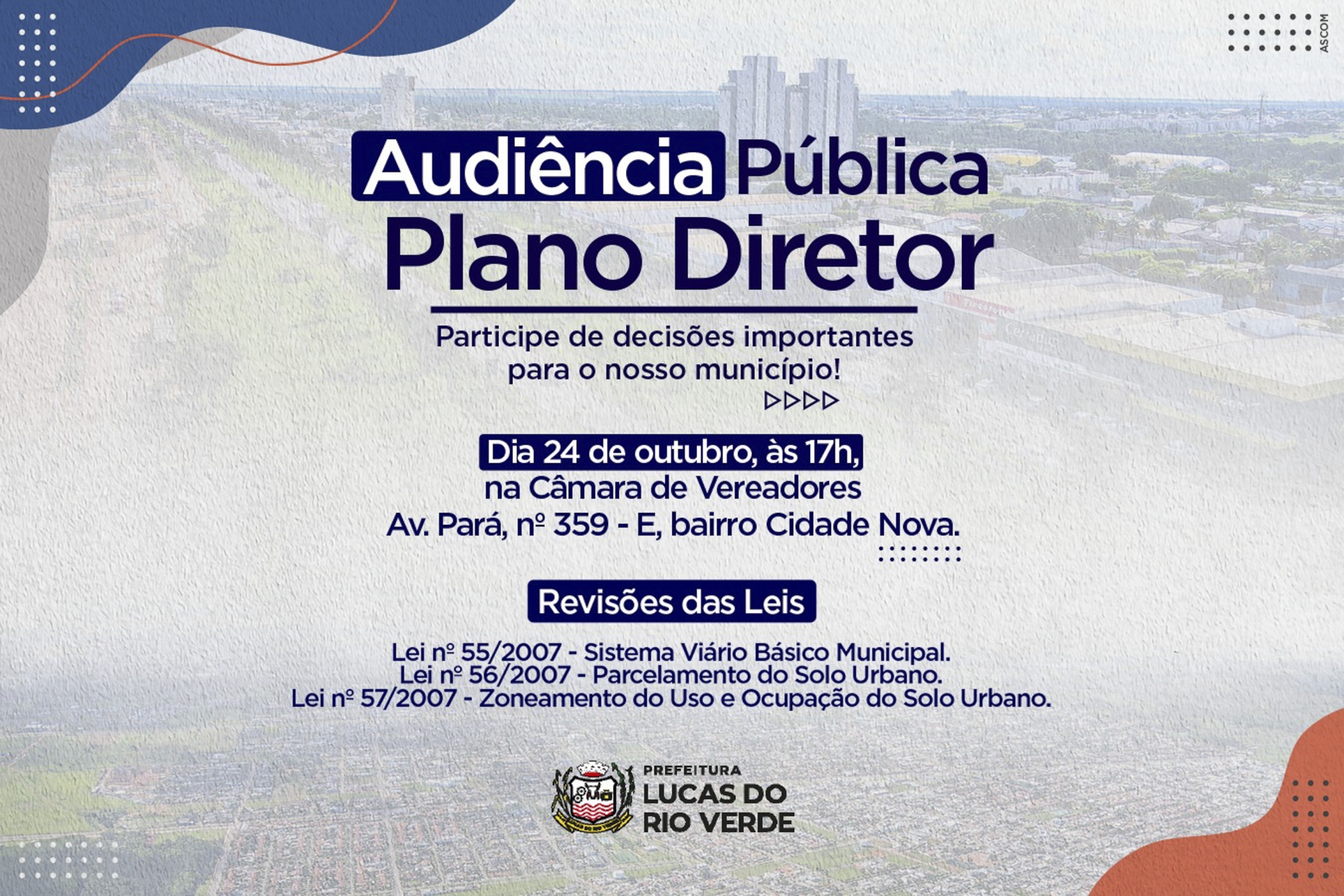 Sistema viário, parcelamento de solo urbano e zoneamento do uso e ocupação do solo urbano são três pontos que serão tratados na audiência pública sobre o Plano Diretor de Lucas do Rio Verde, nesta quinta-feira (24), às 17h, na Câmara de Vereadores.