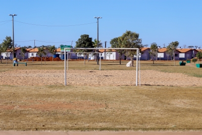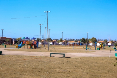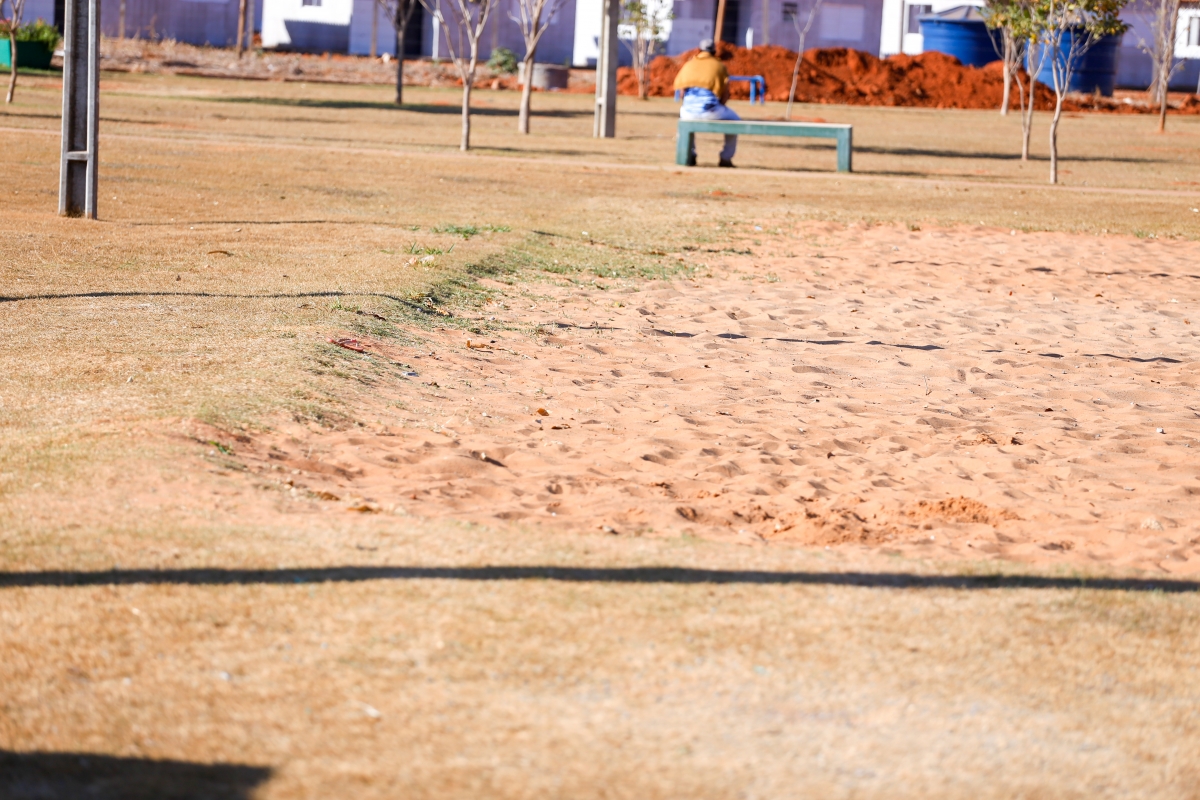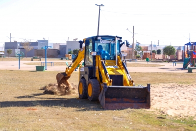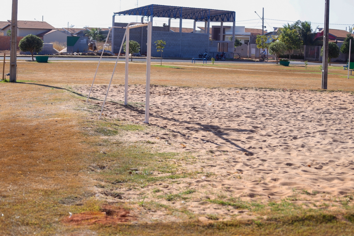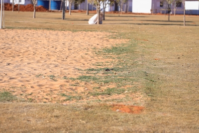 A praça está recebendo melhorias na quadra de areia e parque infantil. Outra ação realizada no local é a construção de uma estrutura a fim de impedir o contato da grama com a areia da quadra.