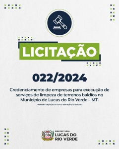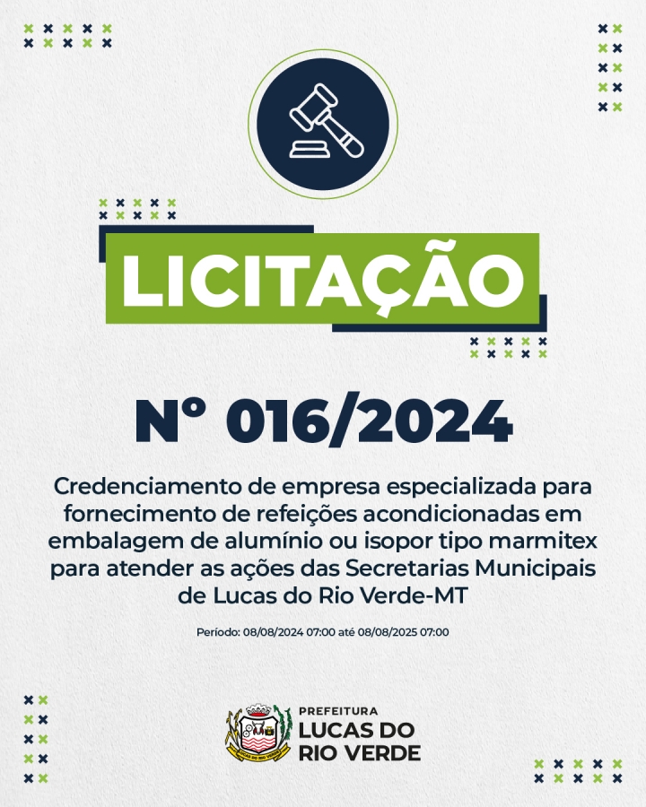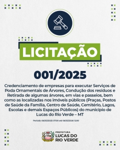 Confira as demais orientações acessando os editais na íntegra por meio do site da Prefeitura de Lucas do Rio Verde, clicando em “Prefeitura online” e depois em “licitações”.