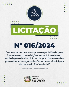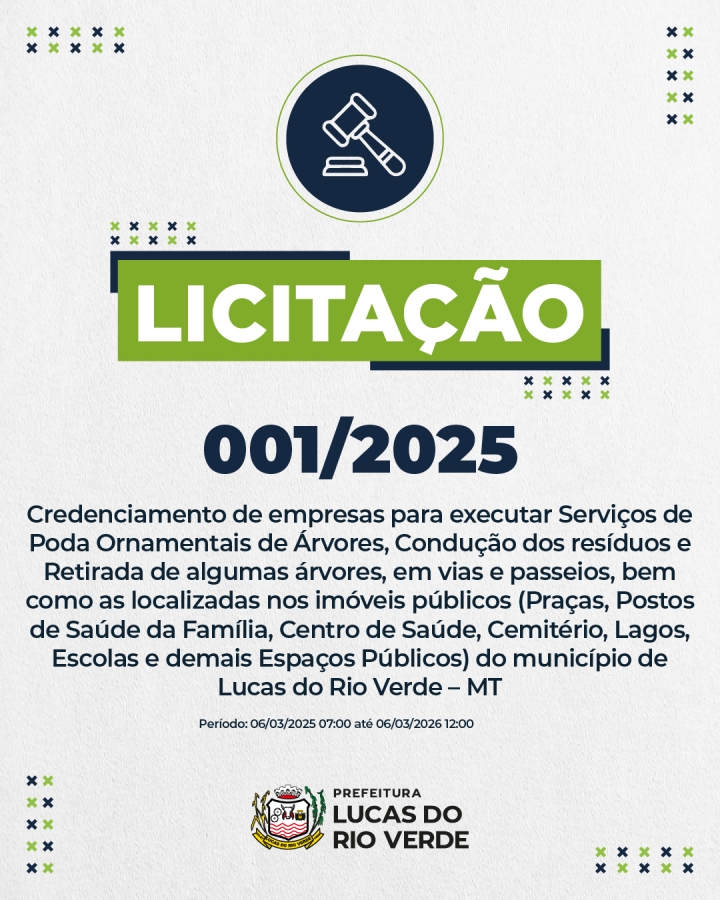 A Prefeitura de Lucas do Rio Verde informa que estão abertos três editais para o credenciamento de empresas interessadas na prestação dos seguintes serviços: poda ornamental de árvores, condução de resíduos e retirada de algumas árvores; limpeza de terrenos baldios e fornecimento de refeições acondicionadas em embalagens de alumínio ou isopor tipo marmitex, destinadas às ações das secretarias municipais.