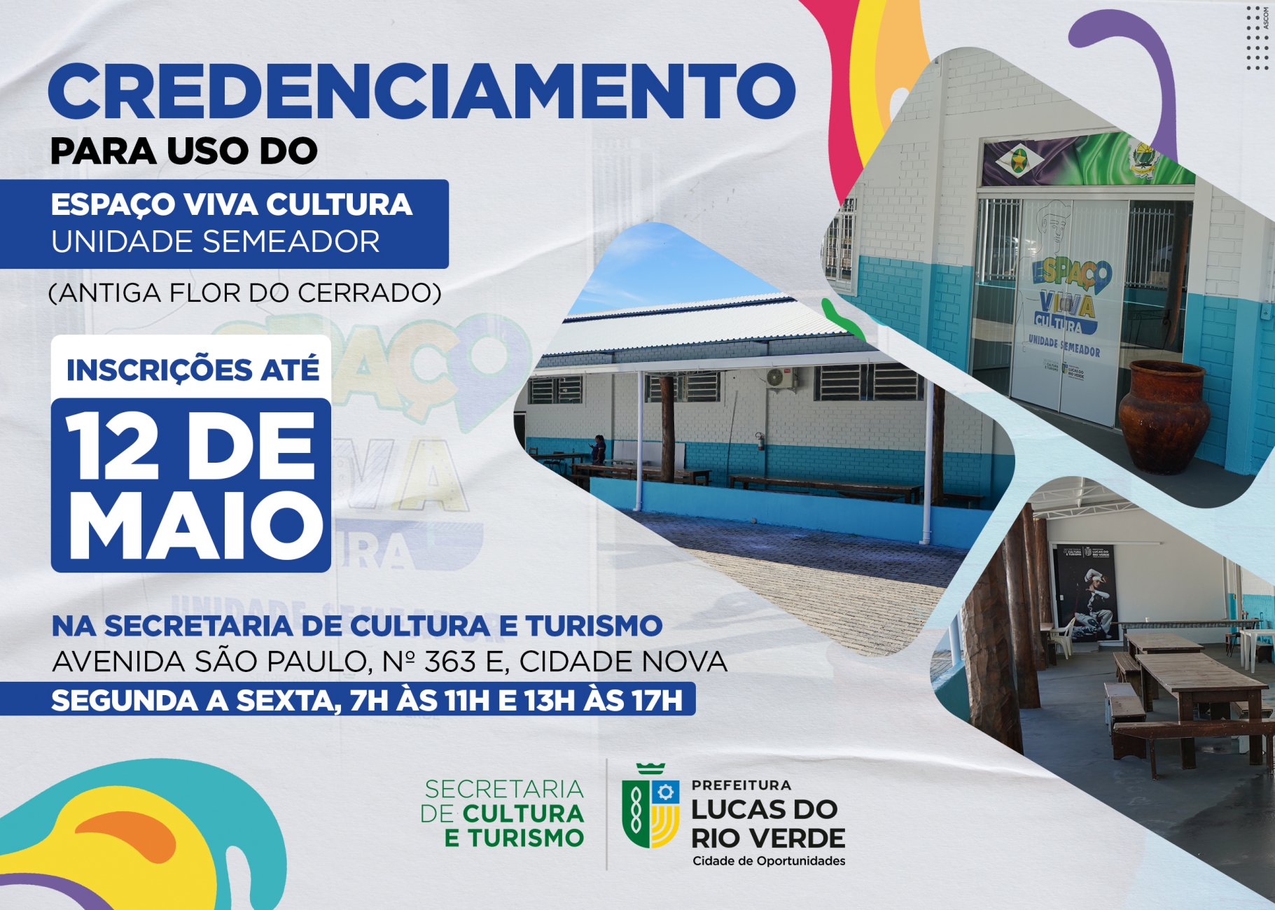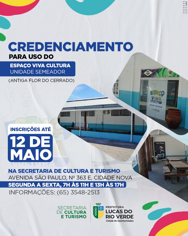 A Prefeitura de Lucas do Rio Verde, por meio da Secretaria de Cultura e Turismo, abriu, nesta terça-feira (02), o credenciamento para uso do Espaço Viva Cultura – Unidade Semeador. O local, que antes funcionava como sede da Associação Flor do Cerrado, passa a fazer parte da Secretaria e atenderá as demais associações que fazem parte do cadastro de cultura do município.
