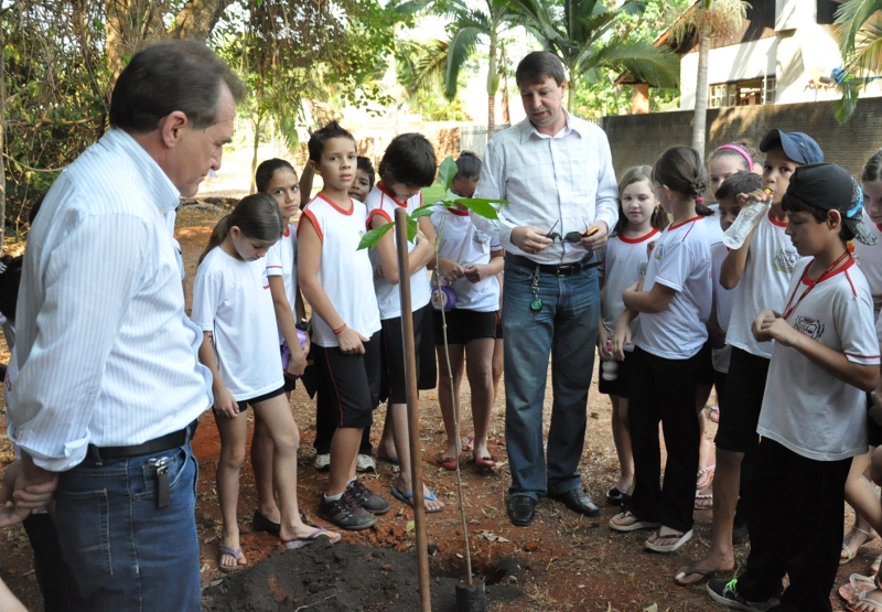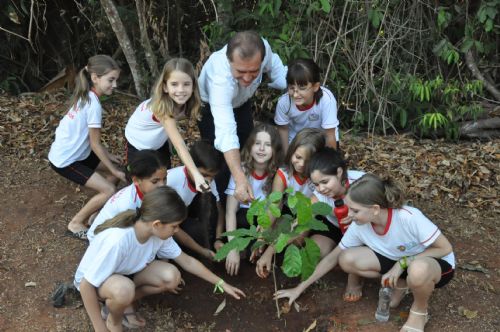 O prefeito em exercício, Joci Piccini, o secretário municipal de Agricultura e Meio Ambiente, Edu Pascoski e os alunos do 4º ano da Escola Municipal Eça de Queirós plantaram na manhã de hoje (21) oito mudas de árvores no Parque Buritis.