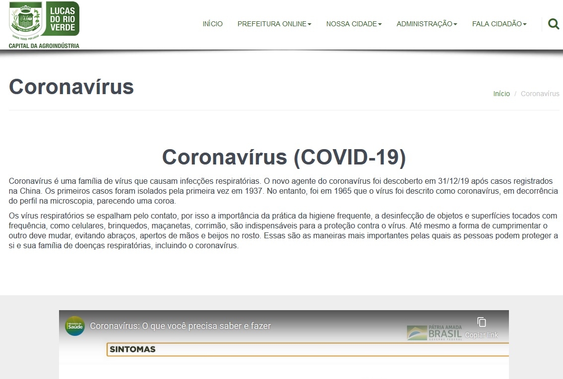 A Prefeitura de Lucas do Rio Verde criou uma página em seu site oficial para disponibilizar informações sobre o Coronavírus (COVID-19). O objetivo é centralizar orientações e links oficiais e divulgar para a população as medidas que a Gestão Binotti tem tomado em relação à doença para evitar que informações falsas sejam espalhadas pela internet.