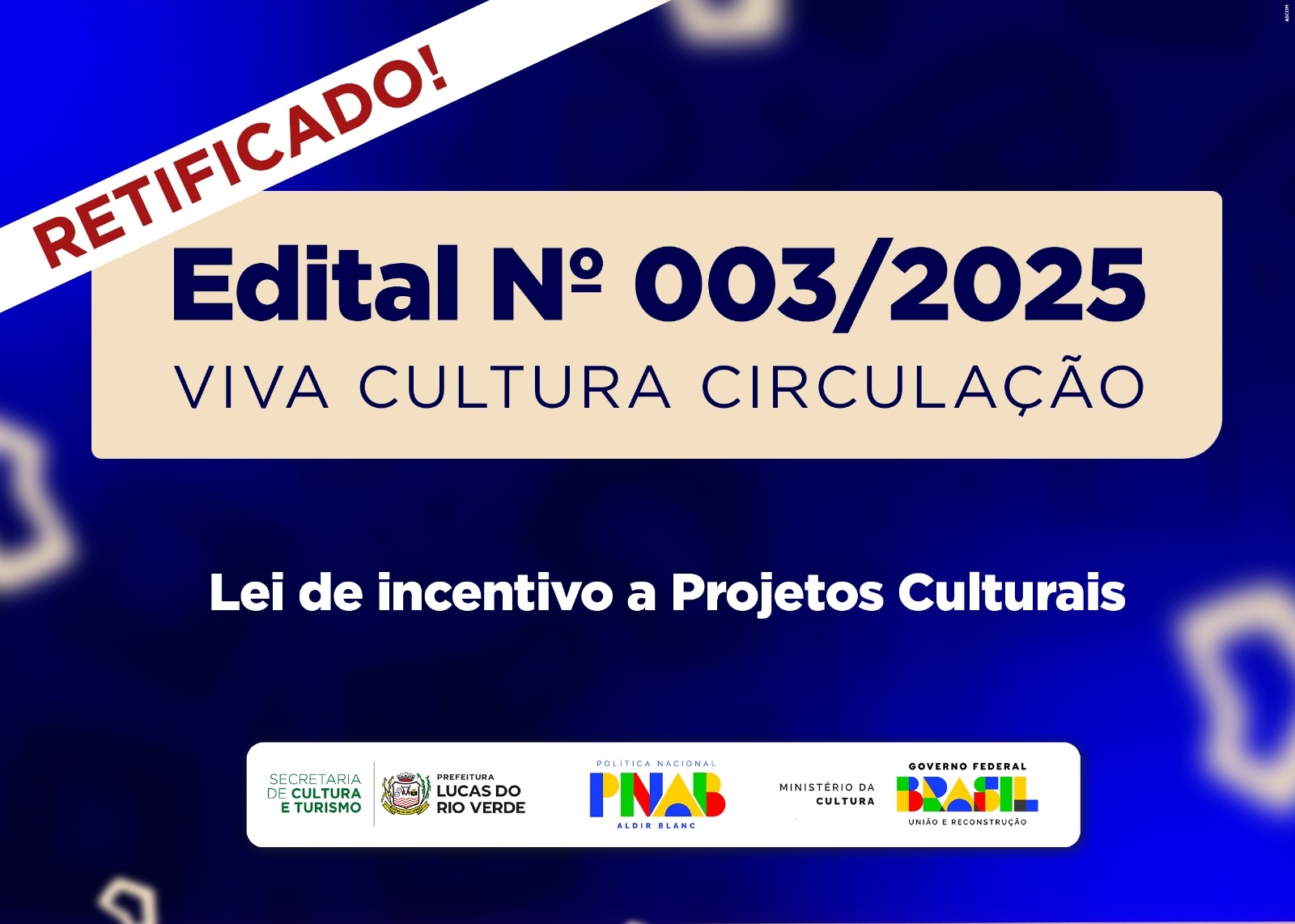 A Prefeitura Municipal de Lucas do Rio Verde, por meio da Secretaria de Cultura e Turismo, torna pública a Retificação nº 03 do Edital de Seleção nº 003/2025, referente ao fomento à criação de projetos culturais no âmbito do programa Viva Cultura Circulação. A iniciativa é viabilizada com recursos da Política Nacional Aldir Blanc de Fomento à Cultura (PNAB) – Lei nº 14.399/2022.