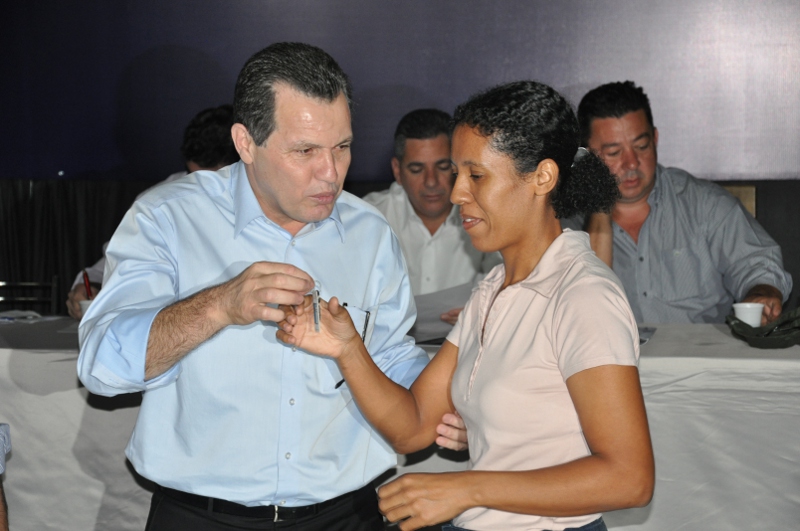 O governador Silval Barbosa e o superintendente da Caixa Econômica Federal em Mato Grosso, Carlos Roberto Pereira tiveram a satisfação de entregar, cada um, uma das chaves as famílias contempladas. Barbosa ressaltou a importância do programa Minha Casa, Minha Vida do Governo Federal que junto com as prefeituras e Estado esta construindo mais de 20 mil casas em Mato Grosso.