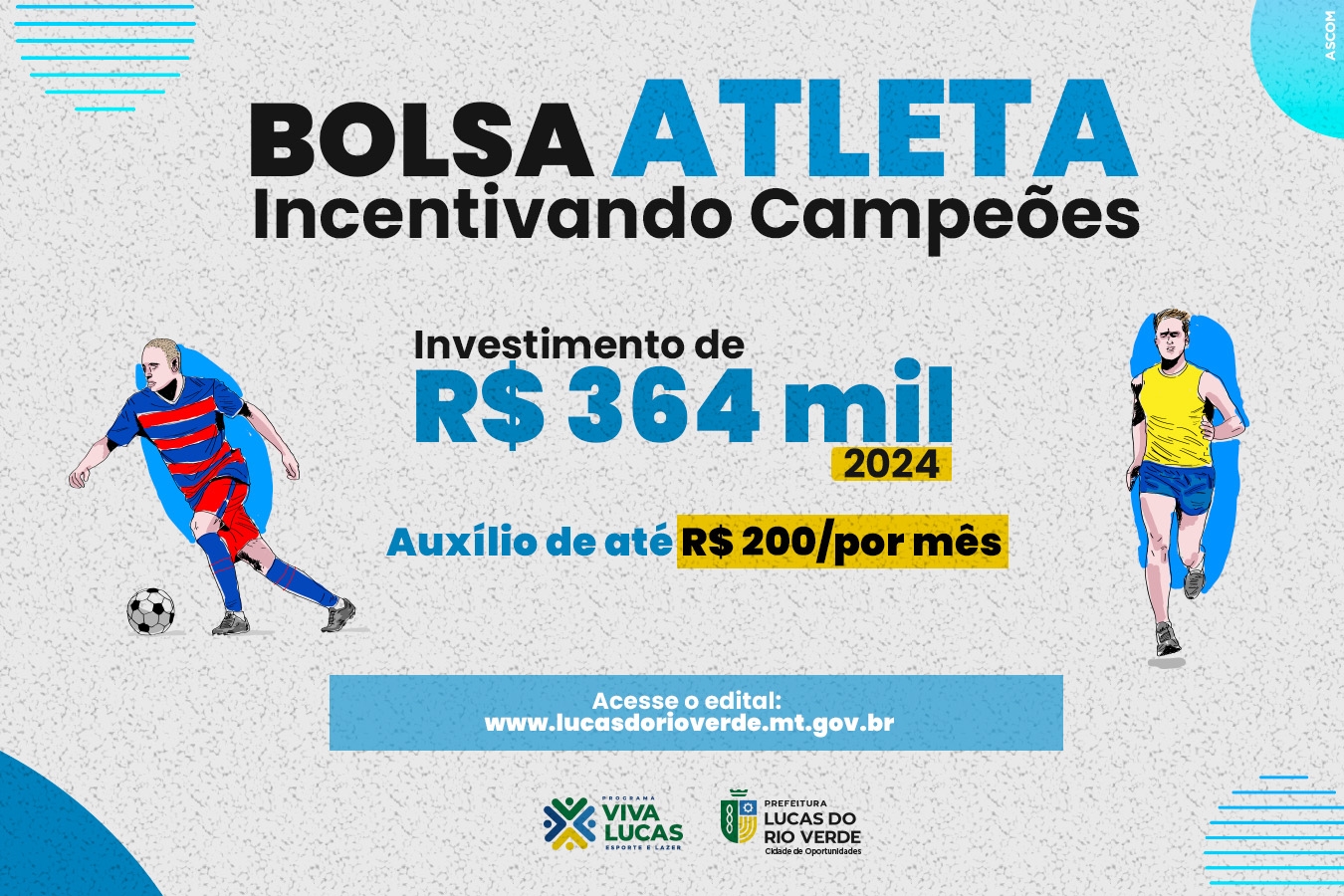 A Prefeitura de Lucas do Rio Verde, por meio da Secretaria de Esporte e Lazer, lançou pelo segundo ano consecutivo o Bolsa Atleta Municipal. O programa de incentivo a prática esportiva tem como objetivo oportunizar aos atletas, de diversas modalidades, um auxílio financeiro para que o esportista possa custear os gastos com uniforme, transporte e materiais que atendam a prática esportiva a qual o mesmo se dedica.