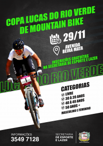 A prefeitura, por meio da Secretaria de Esporte e Lazer, vai realizar no dia 29 de novembro a primeira Copa Lucas do Rio Verde de Mountain bike. Serão quatro categorias, sendo feminino e masculino.