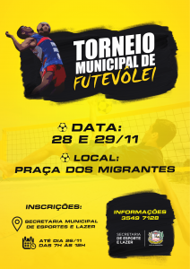 Outro campeonato que está no calendário é o Torneio Municipal de Futevôlei, que também será realizado no dia 29 de novembro, na Praça dos Migrantes. A competição é livre, não havendo categorias.