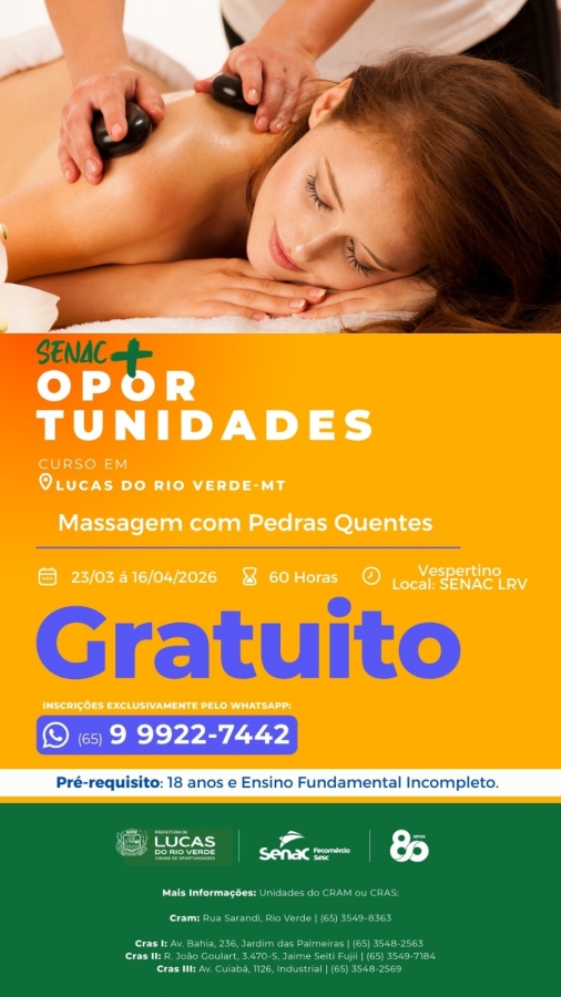 A Prefeitura de Lucas do Rio Verde, em parceria com o Senac, está com inscrições abertas para o curso gratuito de Massagem com Pedras Quentes. A formação será realizada de 23 de março a 16 de abril, com carga horária de 60 horas, no período vespertino. As aulas serão realizadas no Senac de Lucas do Rio Verde.