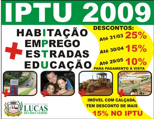A Prefeitura de Lucas do Rio Verde lança mais uma Campanha de Arrecadação do Imposto Predial e Territorial Urbano (IPTU), referente ao ano de 2009. Com o slogan “Em Lucas a gente paga e vê o resultado”, a Prefeitura pretende conscientizar os contribuintes sobre a importância do pagamento dos impostos.