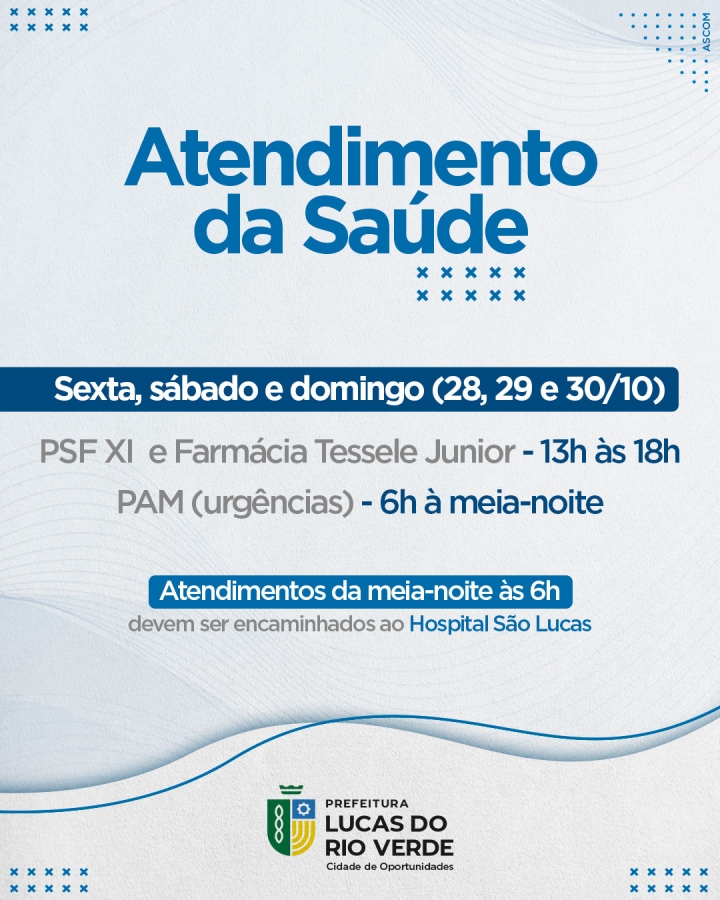 Atendimentos de saúde em outros horários devem ser encaminhados ao Hospital São Lucas.