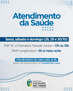 O PSF XI (com sala de vacinas e farmácia), que fica no Tessele Junior, terá atendimento nesta sexta-feira, sábado e domingo, das 13h às 18h.
