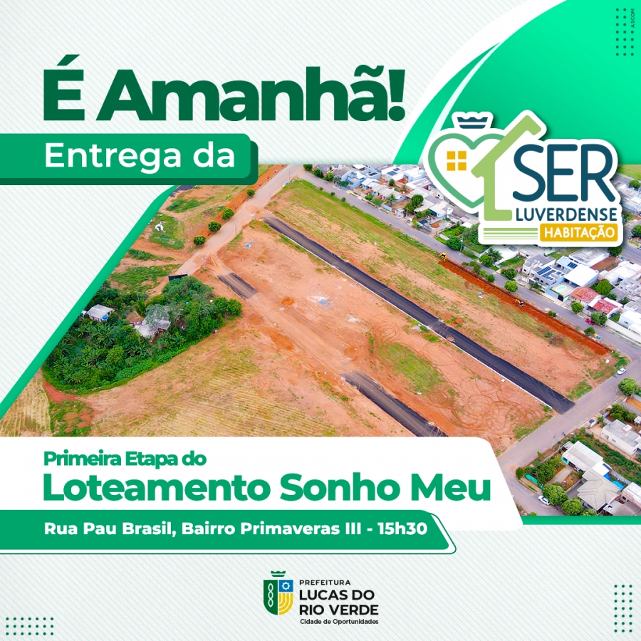 A Prefeitura de Lucas do Rio Verde realiza nesta sexta-feira (03), às 15h30, a primeira etapa do Loteamento Sonho Meu, que contempla lotes que fazem parte do Programa Ser Luverdense Habitação. Os proponentes assinarão os contratos para dar início ao processo de construção das futuras moradias.