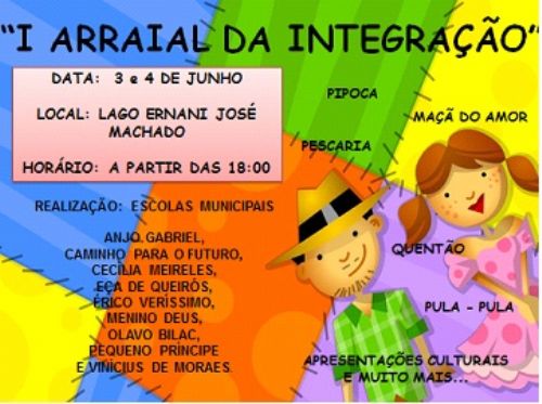 A Secretaria Municipal de Educação de Lucas do Rio Verde promove nos dias 3 e 4 de junho, no Lago Ernani José Machado, o 1º Arraial da Integração. A ideia, segundo a presidente da comissão organizadora, Luciana Bauer, é unir as nove escolas municipais localizadas na área urbana e realizar uma grande festa.