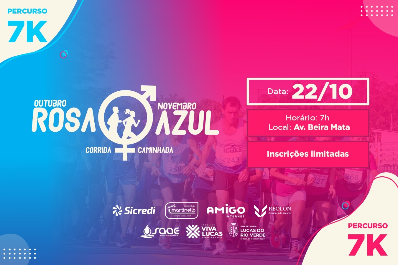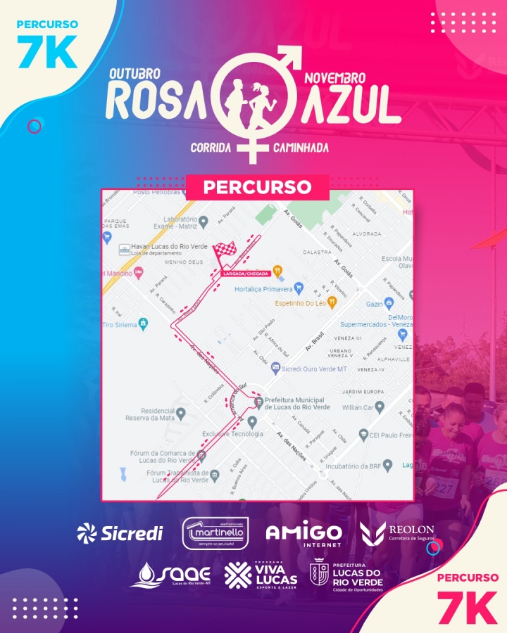 A Corrida Outubro Rosa/Novembro Azul é uma realização da Prefeitura de Lucas do Rio Verde, através da Secretaria de Esporte e Lazer e Secretaria de Saúde, com objetivo de alertar a população sobre a importância da prevenção. No caso das mulheres é incentivado o exame de prevenção ao câncer de mama e de colo de útero e nos homens o preventivo ao câncer de próstata.