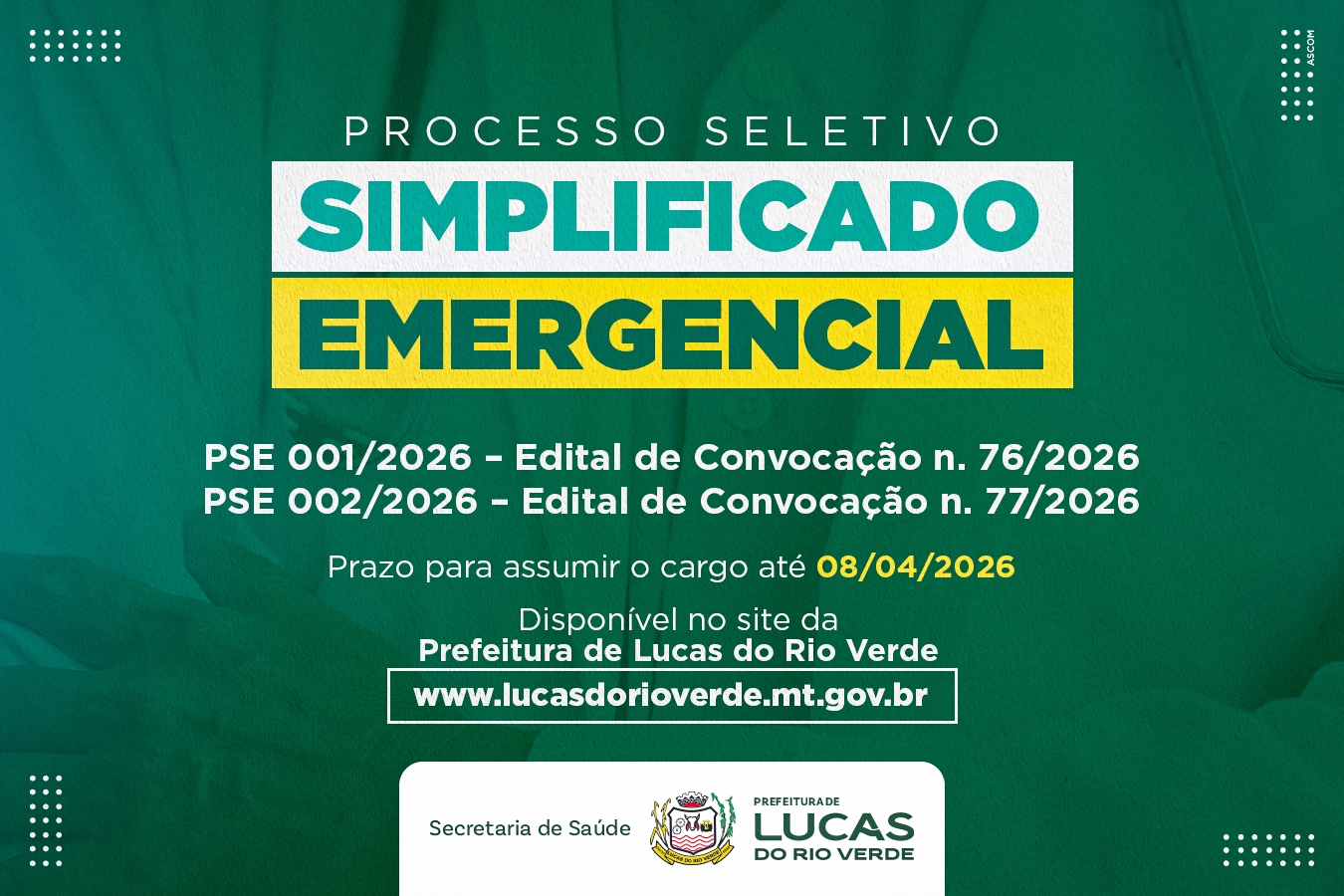 A Prefeitura de Lucas do Rio Verde divulgou nesta segunda-feira (06), dois novos editais de convocação de aprovados, nos Processos Seletivos Emergenciais n. 001/2026 e 002/2026.