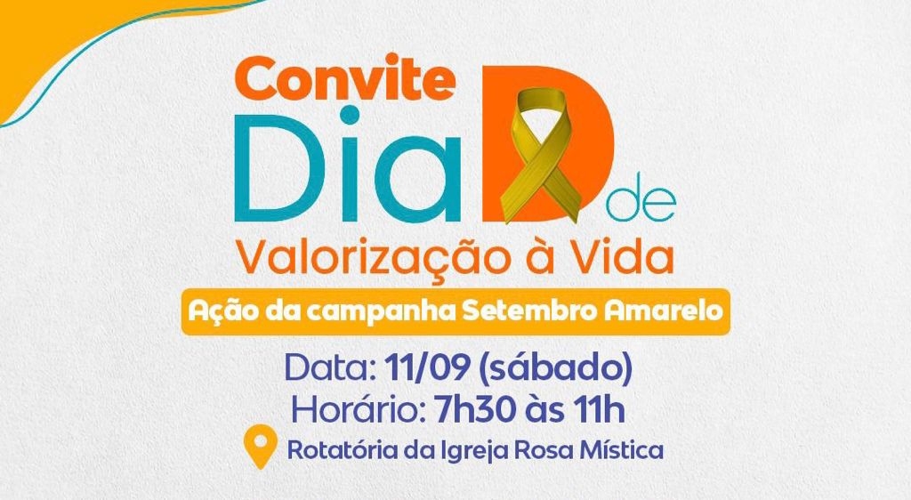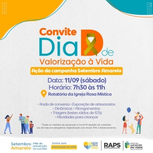 A Prefeitura de Lucas do Rio Verde convida a população para o Dia D de Valorização à Vida, ação da campanha Setembro Amarelo, mês de prevenção ao suicídio. O evento será neste sábado (11), na rotatória da Igreja Rosa Mística, das 7h às 11h.