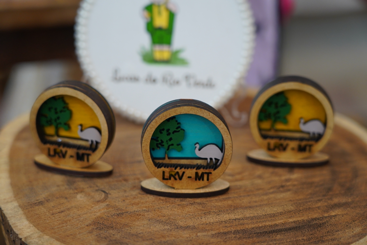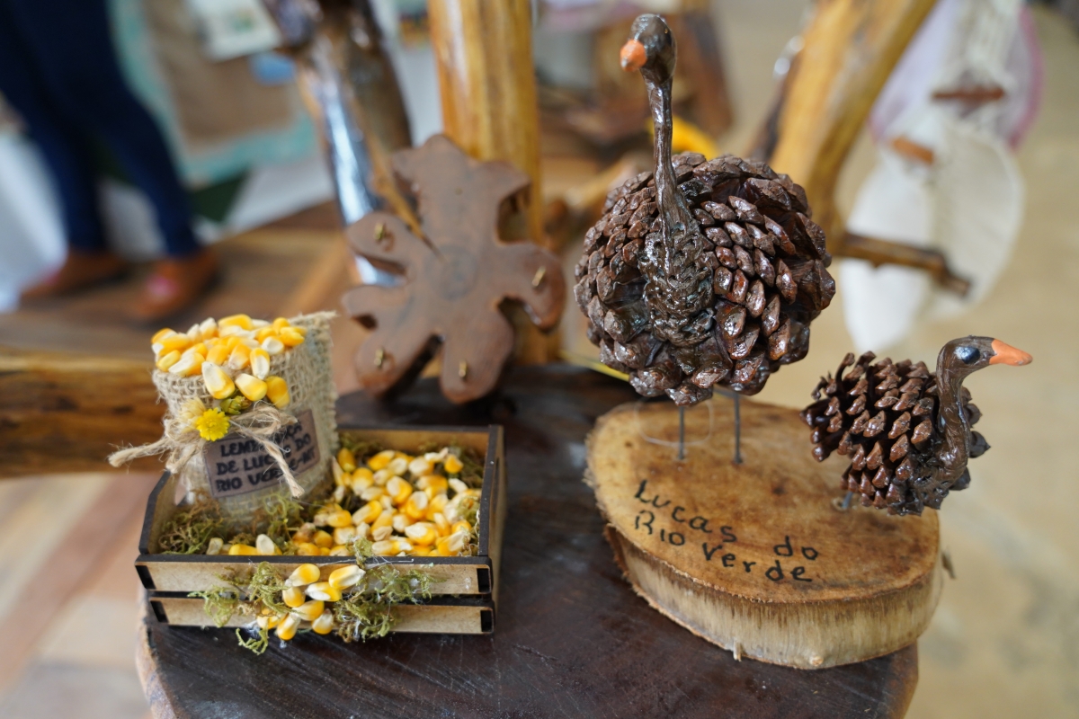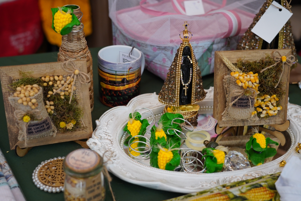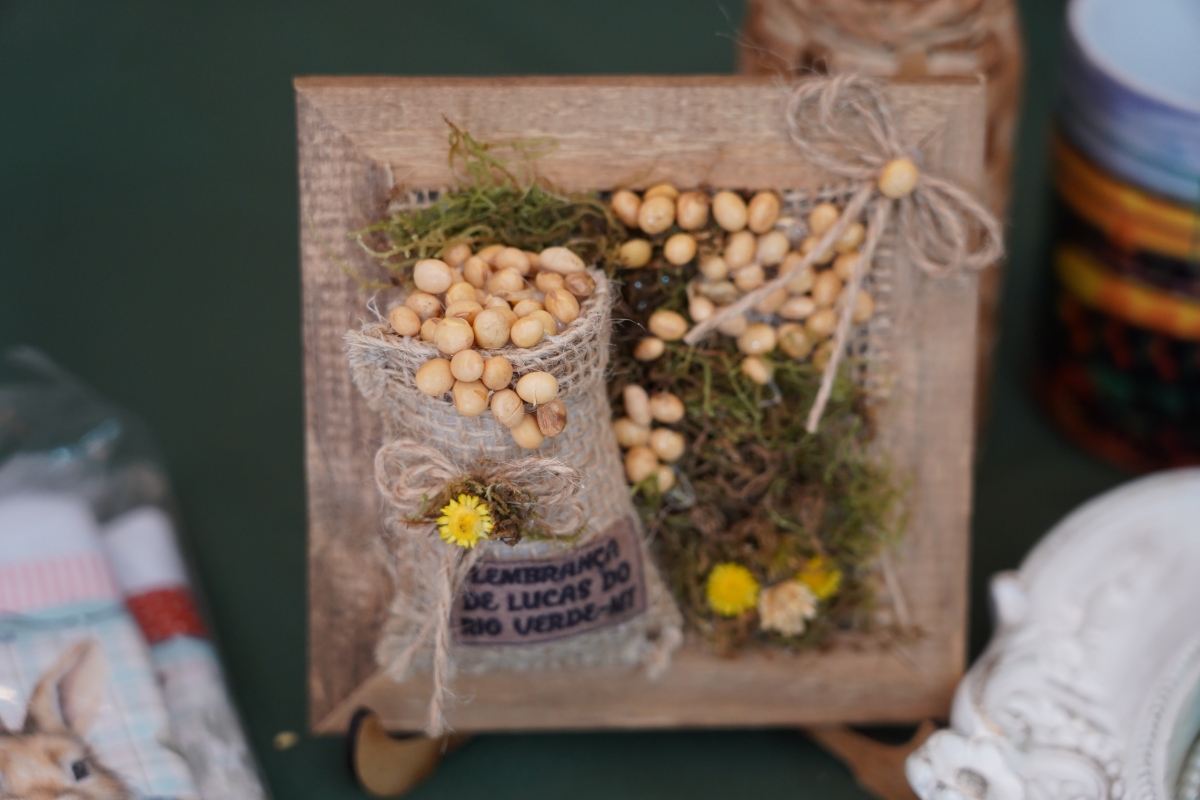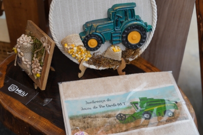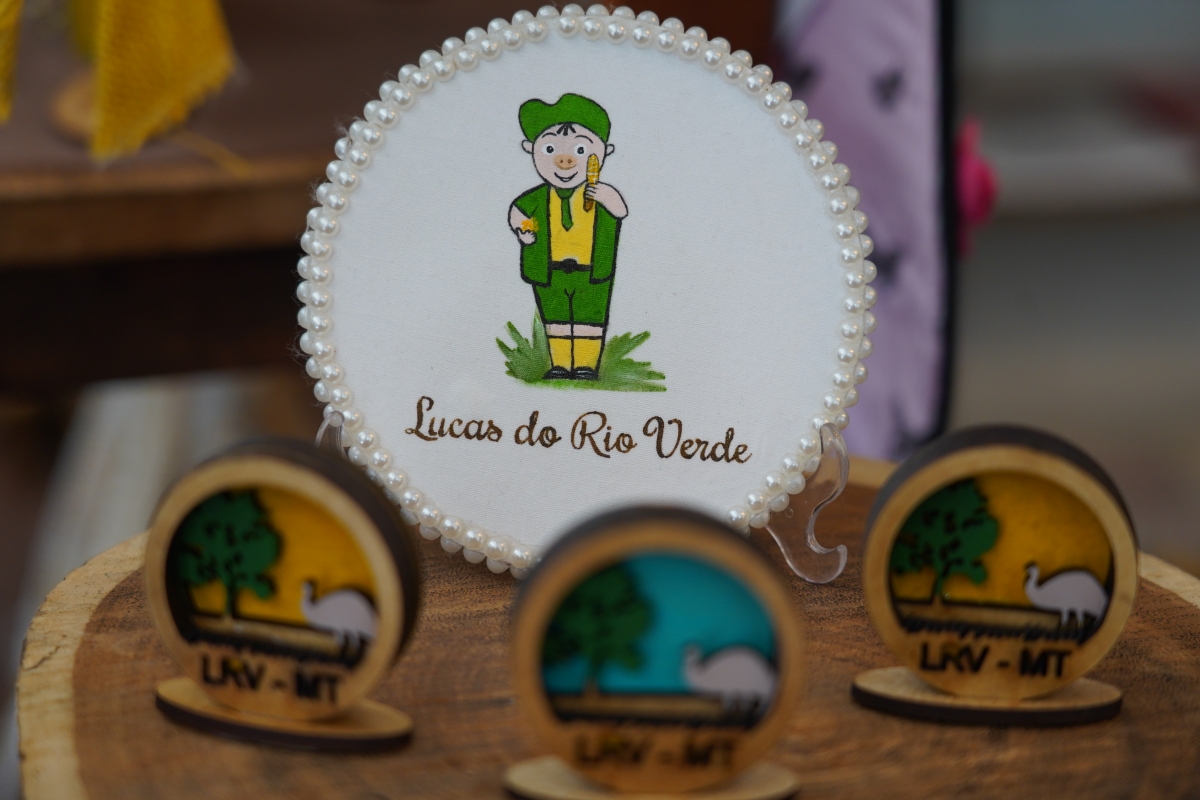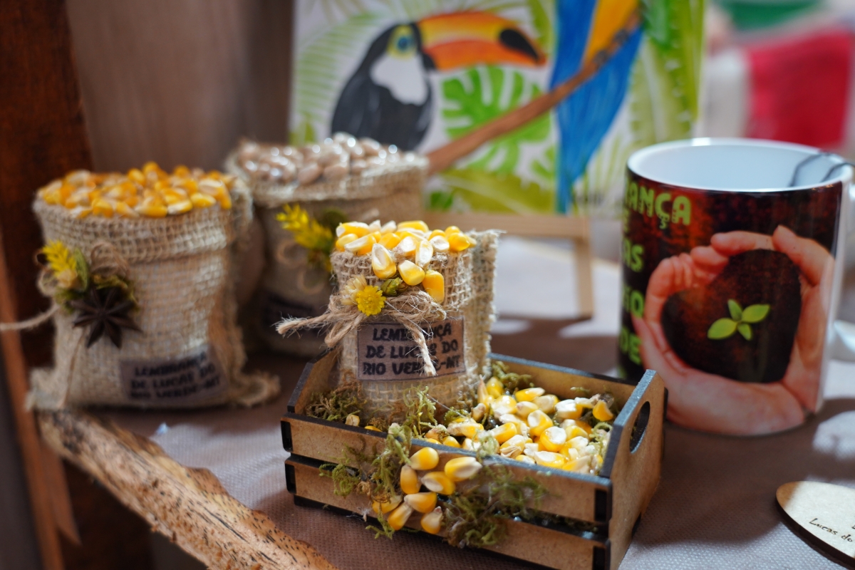 Para a feira, o grupo de artesãos produziu diversos tipos de lembrança da cidade,l na temática do Show Safra, que é o milho e a soja.