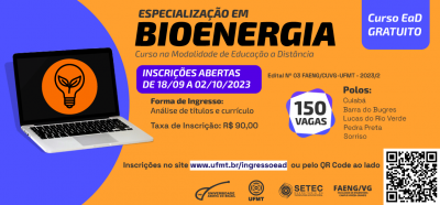 As inscrições vão até o dia 02 de outubro de 2023, e devem ser feitas pelo site www.ufmt.br/ingressoead/cursos/especializacao-em-bioenergia. A taxa de inscrição é de R$ 90,00.