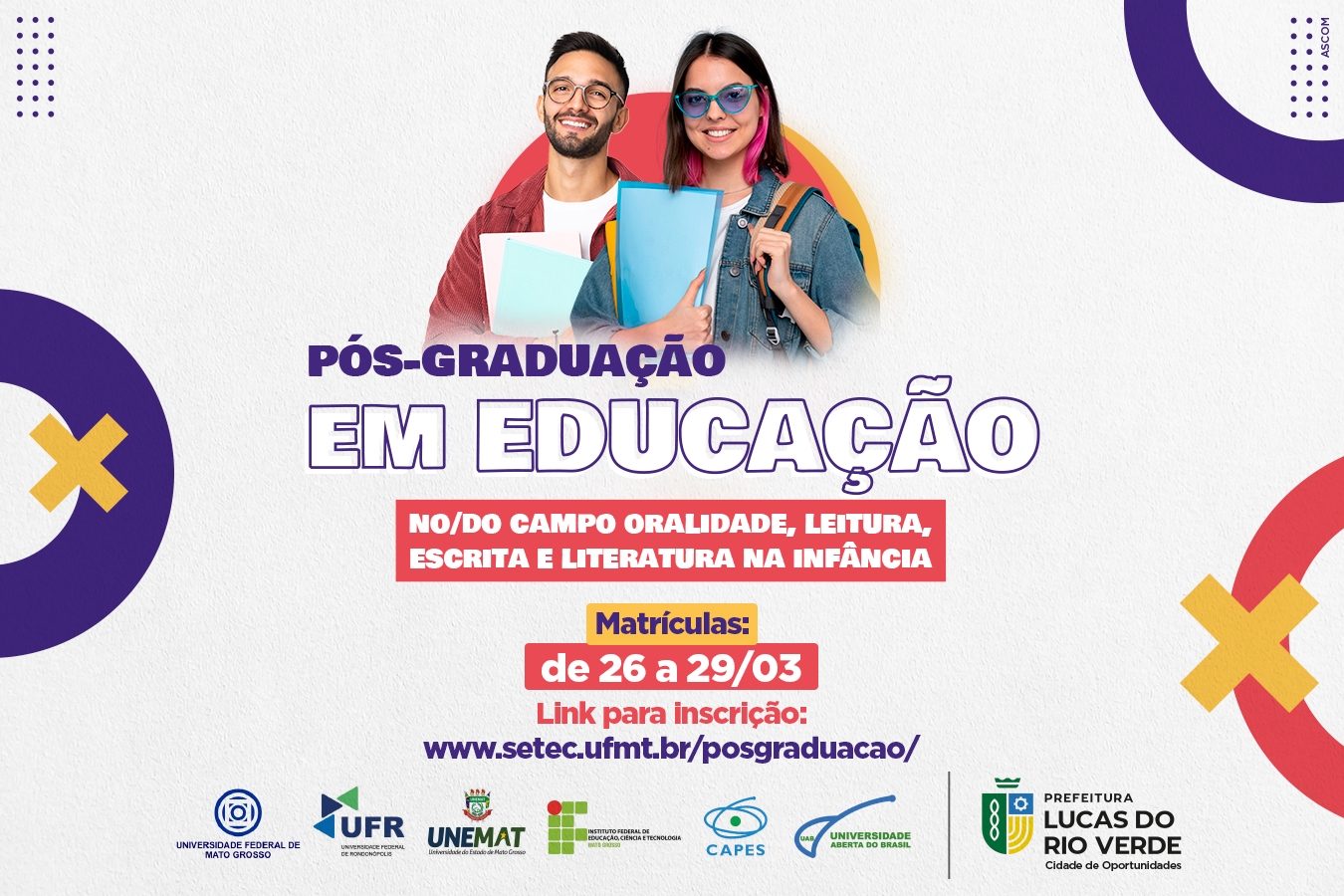 O polo de Lucas do Rio Verde da Universidade Aberta do Brasil (UAB), está com matrículas abertas para os candidatos aprovados no curso de Especialização em Educação no/do Campo: Oralidade, Leitura, Escrita e Literatura na Infância – vagas remanescentes. O curso será realizado pela Universidade Federal de Mato Grosso (UFMT), por meio do Instituto Educação - IE/UFMT Campus Universitário de Cuiabá.