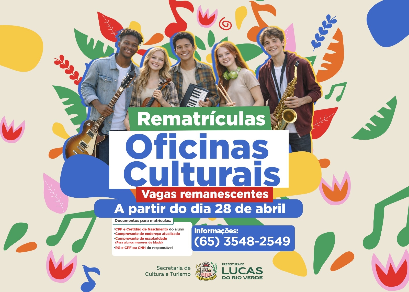 A Prefeitura de Lucas do Rio Verde, por meio da Secretaria de Cultura e Turismo, abre nesta terça-feira (28) as inscrições para as vagas remanescentes das oficinas culturais em 2026. Os interessados devem garantir a participação exclusivamente de forma on-line, por meio do link: https://cultura.lucasdorioverde.mt.gov.br/portal#/
