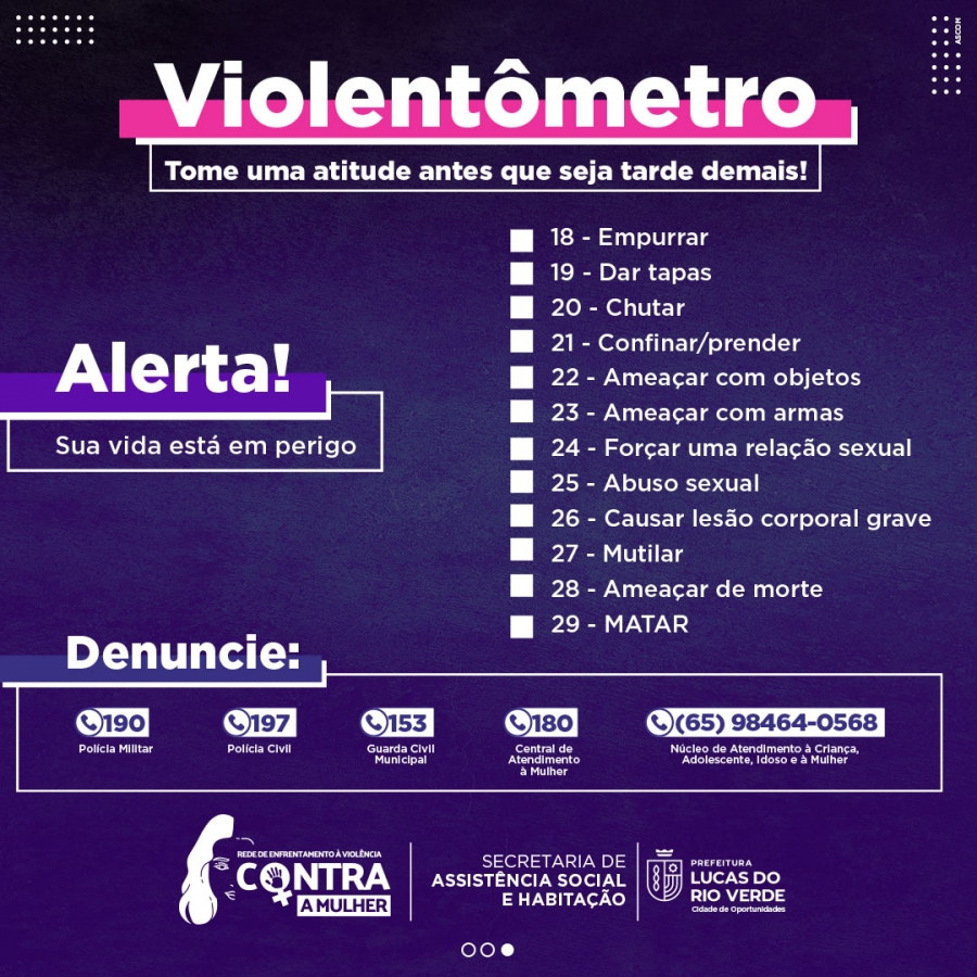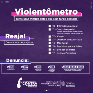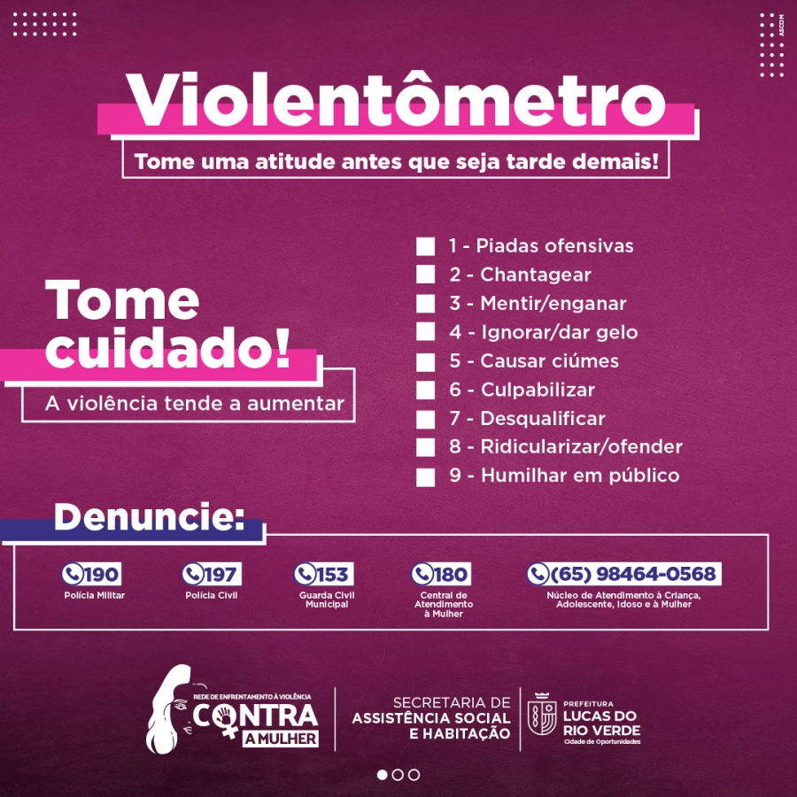 Para ajudar mulheres a reconhecerem se estão sofrendo algum tipo de violência doméstica, a Secretaria de Assistência Social e Habitação de Lucas do Rio Verde reproduziu o Violentômetro, um material gráfico contendo informações para que as pessoas identifiquem os diferentes tipos e graus que a violência pode assumir nas relações de afeto.